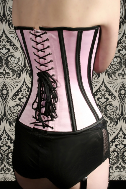 En vacker Dita-korsett i rosa satäng med svart satäng sydd över skenorna för att ge en illusion av ett ännu mer reducerat midjemått.
